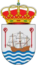 De oro, una carabela, sobre ondas de azur y pIata; la bordura de gules, cargada de siete lises de pIata. Al timbre, corona real cerrada.[2] |
