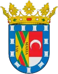 Partido. Primero de azur cortinado de plata, tres coronas de uno en lo otro. Segundo, cuartelado en aspa, primero y cuarto de sinople una banda de gules perfilada de oro, segundo y tercero de oro, con la leyenda "Ave María". Timbrado de Corona Real Española.[24] |