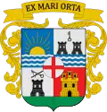 Escudo partido: 1 de oro, un ángel vestido de azul armado con una espada y cabalgando un dragón de púrpura, sobre ondas de azul y plata: 2 de gules, dos letras S y una venera entre ellas, todas de plata, puestas en palo, va timbrado el escudo con la Corona Real Española.[36]