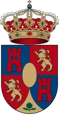 Escudo cuadrilongo de punta redonda. De gules, cinco torres de oro en aspa, mazonadas y aclaradas de sable. En jefe y sobre la torre central, un escudo cuadrado de oro con cuatro palos de gules. Por timbre, corona real abierta.[37] |
