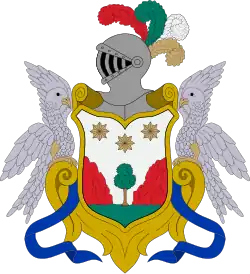 Escudo partido, 1.º de oro, una cruz griega de gules; y 2.º de plata, una mata de sinople. Bordura de azur con cuatro lises de plata. Timbre: Corona real cerrada.[20] ![]()