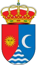 Escudo cortado. 1º de plata, una posada de gules, acompañada en jefe a la diestra y a la siniestra de dos veneras, también de gules. 2º de azur, tres espigas de oro, puestas en faja. Al timbre corona real cerrada.[16] |
