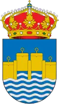 Escudo de plata, tres cabañas de gules puestas en faja; en punta ondas de azur y plata. Jefe encajado de gules. Al timbre corona real cerrada.[37] |