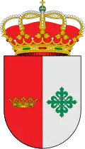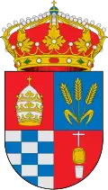 Escudo partido de plata y gules. a) Izquierdo Cruz de Santiago de Gules. b) Espiga de oro puesta en palo. Al Timbre, corona real cerrada.[12] |