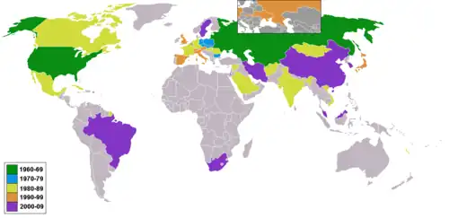 Desde el primer vuelo espacial tripulado de la Unión Soviética, ciudadanos de 39 países han volado al espacio. Para cada nacionalidad, se muestra la fecha de lanzamiento de la primera misión en incluir una persona de ese país. La lista se basa en la nacionalidad de la persona en el momento del vuelo espacial. Solo tres de los treinta y ocho "primeros astronautas de su nación" han sido mujeres (la británica Helen Sharman en 1991, la iraní Ansari en 2006, y la surcoreana Yi So-yeon en 2008). Por otra parte, la primera mujer en ir al espacio fue Valentina Tereshkova en 1963.