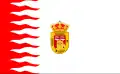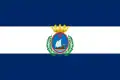 Roja con seis franjas en lo bajo, tres blancas y tres azules. Centradas y sobrepuestas las armas locales.[22] |