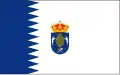 Bandera rectangular en la proporción de 11x18, compuesta por cinco franjas paralelas entre sí y perpendiculares al asta, la primera y quinta azules, 1/8 de la anchura, la segunda y cuarta, blancas, de 1/8 de la anchura, y la tercera o central, amarilla, de 1/2 de la anchura. Centrado y sobrepuesto, el escudo de armas local.[30] |