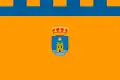 Amarilla con seis bandas rojas y, brochante, una estrecha negra. Centrado y sobrepuesto, el escudo de armas local.[29] |