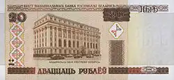 | 20 Rublos | Banco Nacional de Bielorrusia | Amarillo | 69 x 150 mm |