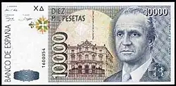 | 10.000 pesetas | Juan Carlos I y Palacio de Linares | Jorge Juan y Santacilia | Gris | 74 x 154 mm |