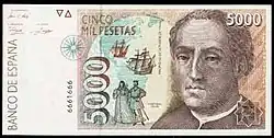 | 5000 pesetas | Cristóbal Colón | Esfera armilar | Marrón | 71 x 146 mm |