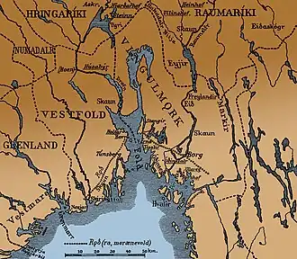 - ↑ Grenland, Grænafylket y Vestmar eran territorios comunes, unos se referían al interior y otras a zonas costeras y riberas de lagos.