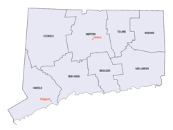 Esta es una relación de los condados de Connecticut. Hay actualmente ocho condados en el estado estadounidense de Connecticut. Cuatro de ellos fueron creados inicialmente en 1666, durante la primera consolidación de la colonia de Connecticut a partir de varias colonias más pequeñas. Dos condados más se crearon durante la época colonial, y solo dos, Middlesex y Tolland, se crearon desde la independencia estadounidense, ambos en 1785. La mayoría de los condados de Connecticut recibe su nombre de lugares de Inglaterra, de donde provenían muchos de los primeros pobladores de Connecticut.[1] Aunque Connecticut esté dividido en condados, no existe ningún gobierno de condado, y la administración municipal está al cargo de las ciudades (city) y pueblos (town).[2][3] El gobierno de los condados fue abolido en Connecticut en 1960, aunque los nombres se mantienen con propósitos geográficos. El estado, sin embargo, todavía utiliza los condados para organizar su sistema estatal judicial y de marshals. Las jurisdicciones judiciales de Connecticut todavía se ciñen a los límites de los condados, excepto Fairfield, Hartford y New Haven, que han sido subdivididos en varias jurisdicciones.