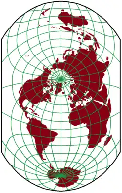 Ernst Hammer | Pseudoacimutal | Equivalente | Modificación del mapa ecuatorial azimutal de igual área. El borde es una elipse 2:1. Las variantes son versiones oblicuas, centradas a 45°N. |