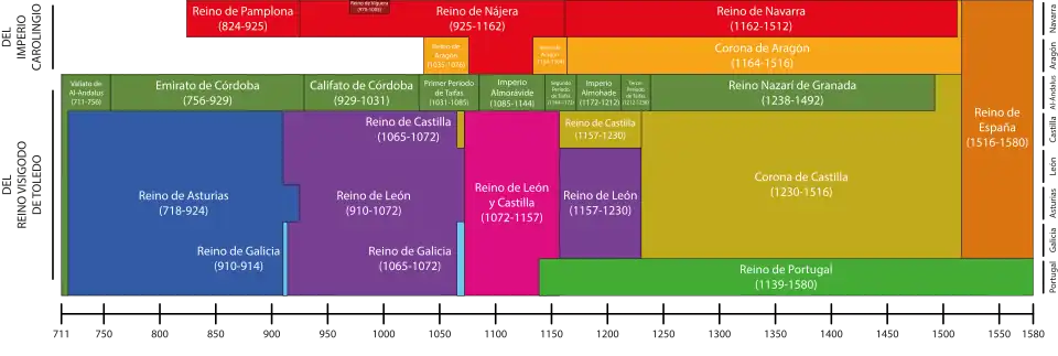 La conquista musulmana de la península ibérica del siglo VIII produjo la división del espacio peninsular entre la España musulmana (al-Ándalus, término también equivalente a los de "España", "Hispania", "Iberia" o "península ibérica") y los reinos cristianos medievales peninsulares o hispano-cristianos[4] surgidos a partir de los núcleos de resistencia cristiana en el norte. Estos, tras un proceso secular denominado Reconquista, terminaron por ocupar la totalidad del espacio peninsular en 1492. En ocho siglos, las conformaciones políticas de ambos espacios fueron extraordinariamente cambiantes, tanto entre los musulmanes (emirato y califato de Córdoba, reinos de taifas, integración en los imperios almorávide y almohade, reino nazarí de Granada) como entre los cristianos. El reino de Asturias se transformó en reino de León, del que se separaron los condados de Portugal y de Castilla; el reino de Pamplona se transformó en el reino de Navarra, que con Sancho III el Mayor (primer tercio del siglo XI) controlaba Castilla (incluso, brevemente, León) y los condados pirenaicos de Aragón, Sobrarbe y Ribagorza. La división de todo ese conjunto entre sus herederos (dinastía Jimena) hizo surgir los reinos de mayor proyección posterior, Aragón y Castilla, que se unificaron respectivamente con el condado de Barcelona y con León. Su crecimiento (pactado desde el Tratado de Tudilén de 1151) dejó arrinconados al reino de Navarra y el condado de Urgel (el primero se mantuvo independiente hasta 1512 y el segundo hasta 1413).