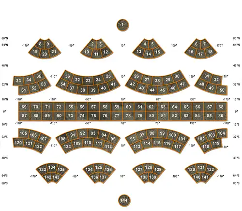 - (±64° a ±48°) 12 cuadriláteros de 30°, comenzando en −80°