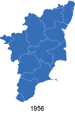 Después de la independencia de la India en agosto de 1947, la antigua presidencia de Madrás de la India británica pasó a llamarse Estado de Madrás. Tras las reorganizaciones de los estados en 1953 y 1956, se establecieron las fronteras estatales actuales. Su nombre oficial pasó a ser Tamil Nadu en 1967. En 1956, el estado de Madras estaba compuesto por los siguientes 13 distritos: Chingleput, Coimbatore, Kanyakumari, Madras, Madurai, Nilgiris, North Arcot, Ramanathapuram, Salem, South Arcot, Thanjavur, Tiruchirappalli y Tirunelveli. Desde entonces, los distritos se han dividido de la siguiente manera: