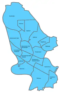 Los 17 distritos municipales (Stadtbezirke) se dividen en 24 barrios (Stadtteile) y 78 distritos estadísticos (Statistische Bezirke).[2][3]