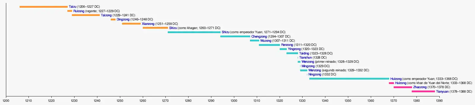 | Yesün Temür | Ninguno | Ninguno | Ninguno | Borjigin Yesün-Temür (孛兒只斤也孫鐵木兒 Bó'érjìjǐn Yěsūntiěmùér) | 1293-1328 | 1323-1328 | Taiding (泰定 Tàidìng) 1321-1328