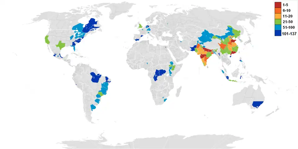 Las 137 subdivisiones nacionales más pobladas del mundo.
