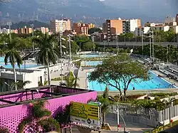 Dentro de la Unidad Deportiva Atanasio Girardot se construyó un complejo acuático de cuatro piscinas desarrollado por los arquitectos Édgar Mazo y Luis Rodrigo Callejas y Sebastian Mejía de la oficina de Paisajes Emergentes. El diseño es de un paisaje horizontal acompañados por jardines de especies endémicas. Fueron construidas dos piscinas olímpicas con el objetivo de dedicar una para competencias de velocidad y la otra para actividades subacuáticas. Esta última piscina está levantada sobre el piso de manera de permitir apreciar las actividad bajo el agua a través de una venta. La capacidad para el público es de 900 sillas con la posibilidad de aplicar el foro con graderías móviles.[9]