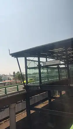| 416 Oriente | F1 y F3 | 414 | La Pradera | 21 de enero de 2016 | Ubicado en Av. 499 entre la Av.414-A y la 416. Su nombre viene de la Calle 416 Oriente que está cerca de la estación. El símbolo es una rosa de los vientos que está señalando al oriente. Solo se puede usar en dirección Villa de Aragón | ||