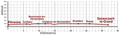 La ruta abandona Péronne en dirección sureste saliendo por la contigua Doingt —la Duin de Sigerico—. Durante toda la etapa discurre por caminos al este de la carretera D-44 primero y posteriormente de la D-32.[10] A los 6 km atraviesa Cartigny (700 hab.)[10] que cuenta con varios monumentos.[11] Tras esta localidad entra en el denominado Pays de Vermandois y alcanza tras 4 km Bouvincourt-en-Vermandois (150 hab.) y 2 km después Vraignes-en-Vermandois (150 hab.).[10] A 10 km de esta última llega a Étreillers (1200 hab.) y 3 km después a Roupy (230 hab.).[10] Recorriendo 6 km alcanza Seraucourt-le-Grand donde se cruza el río Somme y el Canal de Saint-Quentin que discurre paralelo al mismo.[10] Al igual que otras localidades en la zona, Seraucourt-le-Grand fue completamente arrasada durante la I Guerra Mundial. En este lugar y junto al puente para cruzar el Somme se encuentra la iglesia de Saint-Martin que se estima es la correspondencia actual con la estación LXXIII Martinwaeth, del Itinerario de Sigerico.[12]