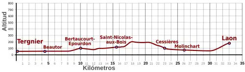 La ruta comienza desde la estación ferroviaria de Tergnier y se dirige hacia el este cruzando primero el Canal de Saint-Quintin y posteriormente, girando al sur, el Canal de la Sambre à l'Oise para entrar, tras 4,5 km, en Beautor (2600 hab.) y 5,5 km después llegar a Bertaucourt-Epourdon.[17] Tras esta población, la ruta sigue durante 13 km hasta Cessières, recorrido en el que cruza durante 10 km el bosque de Saint-Gobain[17] que debe su nombre a Gobano de Irlanda (Gobain de Voas), un monje irlandés que vivió como allí como un ermitaño y murió martirizado en el 670 siendo declarado santo por la Iglesia Católica.[18] Al cruzar este bosque se pasa por Saint-Nicolas-aux-Bois (113 hab.) donde se encuentran los restos de dos abadías: la benedictina que da nombre a la localidad y otra fortificada denominada Le Tortoir. Ambas está declaradas monumentos históricos.[19] Cessières es una población de 500 habitantes tras la que recorriendo 3 km se llega a Molinchart (320 hab.) y 7 km. después a Laon villa con 25 300 habitantes, cabeza del cantón y final de la etapa.[17] Este punto corresponde con la estación LXXII Mundlothuin del Itineraio de Sigerico.[8]