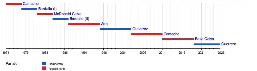 El gobernador actual es Lou Leon Guerrero, del partido demócrata que asumió el cargo el 7 de enero de 2019 y reedito su mandato después de ganar las elecciones de 2022.
