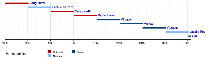 | 29[1] | Rivera, Flores, Batlle y Grau, Ellauri, Varela, Latorre, Vidal, Santos, Tajes, Herrera y Obes, Idiarte Borda, Cuestas, Batlle y Ordóñez, Williman, Viera, Brum, Serrato, Campisteguy, Terra, Baldomir, Amézaga, Berreta, Batlle Berres, Martínez Trueba, Gestido, Pacheco, Bordaberry, Sanguinetti y Batlle Ibáñez | |