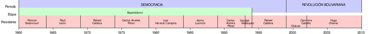- El mandato por parte de un civil más largo registrado ha sido el de Nicolás Maduro (actual presidente; 12 años, 5 meses y 29 días) entre 2013-2019, 2019-2025 y 2025-2031; siguiéndole Rafael Caldera (10 años), entre 1969-1974 y 1994-1999 .