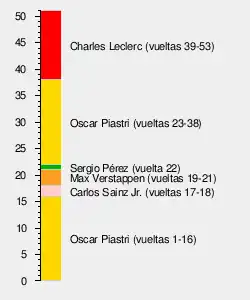 En las vueltas finales, McLaren realizó las "reglas papaya" que hizo cambiar de posiciones a sus pilotos. Mientras que varios equipos van a dos paradas, Ferrari planeó una sola, por lo que Charles Leclerc se convirtió en el último líder.[12]