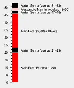 Alain Prost, 1:43.506 - Prost y Senna colisionaron entre ellos al tratar de adelantar el segundo al primero. Tras la colisión, el francés abandonó en el acto, pero el brasileño no se bajó del monoplaza y volvió a la pista saltándose una chicane por la escapatoria. El choque provocó problemas en el frontal del vehículo de Senna, que tuvo que pasar por boxes, donde pudo haber decidido retirarse. No obstante, continuó en pista y ganó la carrera. Al término de la misma sería descalificado por esta acción, dándole la victoria a Alessandro Nannini.