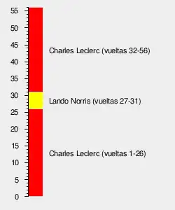 - Lando Norris finalizó tercero en la pista, pero recibió cinco segundos de sanción por dejar la pista y ganar ventaja al intentar adelantar a Max Verstappen.[15]
