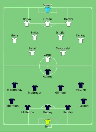 - ↑ El asistente técnico de Marco Rossi, Cosimo Inguscio recibió la tarjeta amarilla en el banquillo por múltiples protestas hacia el árbitro principal Danny Makkelie.