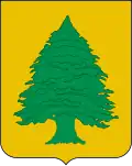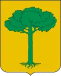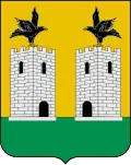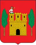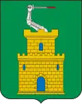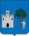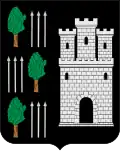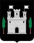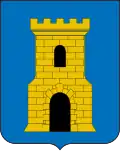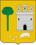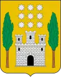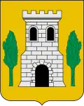 De oro, una torre de piedra acostada de dos álamos de sinople, uno a cada costado. |