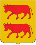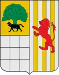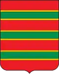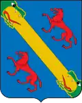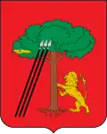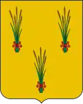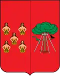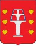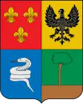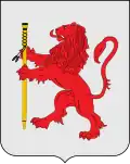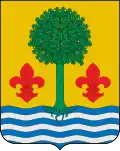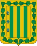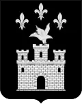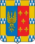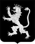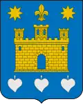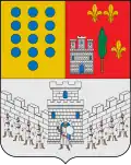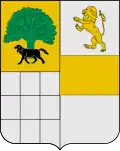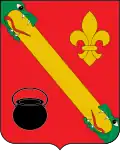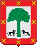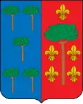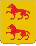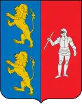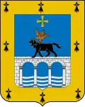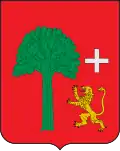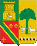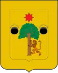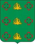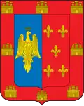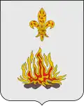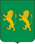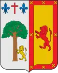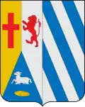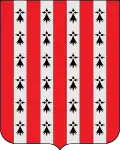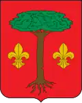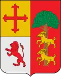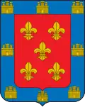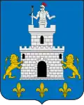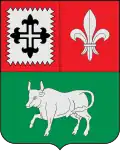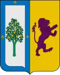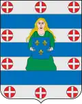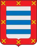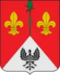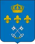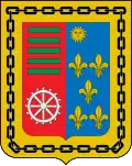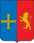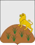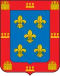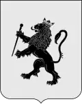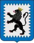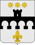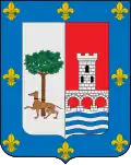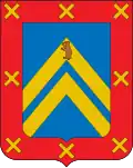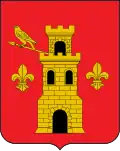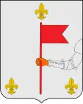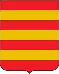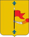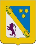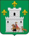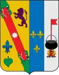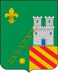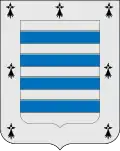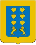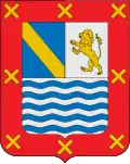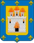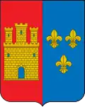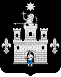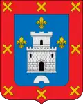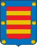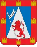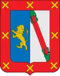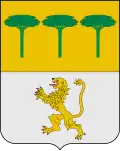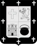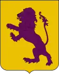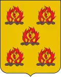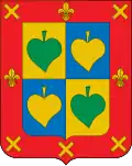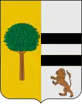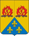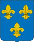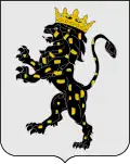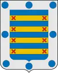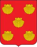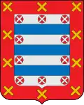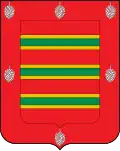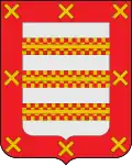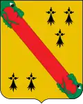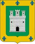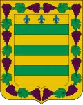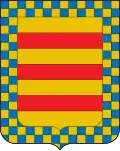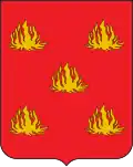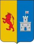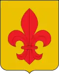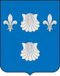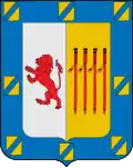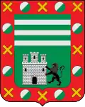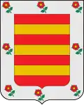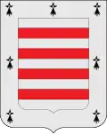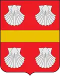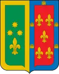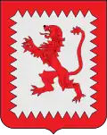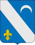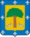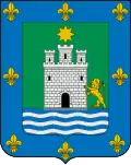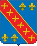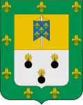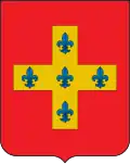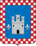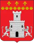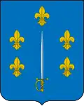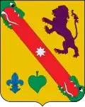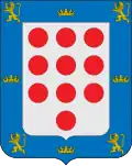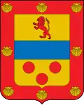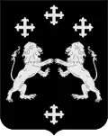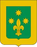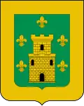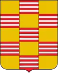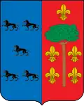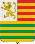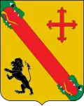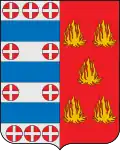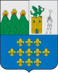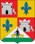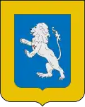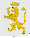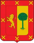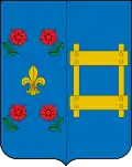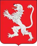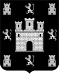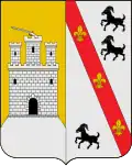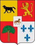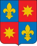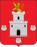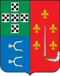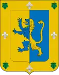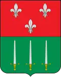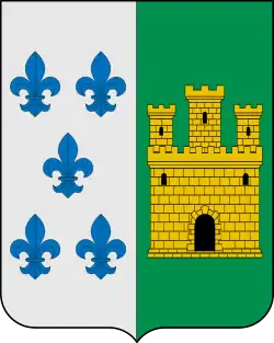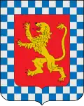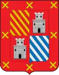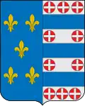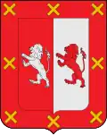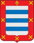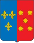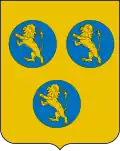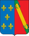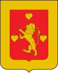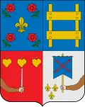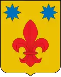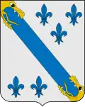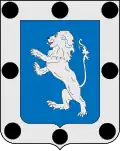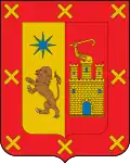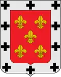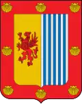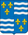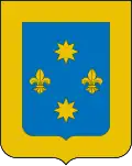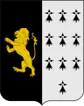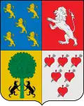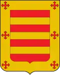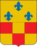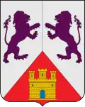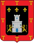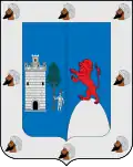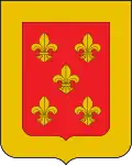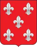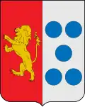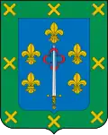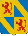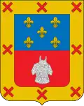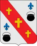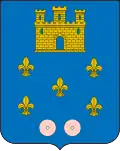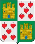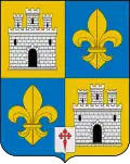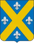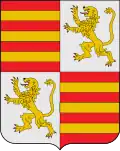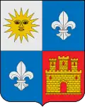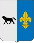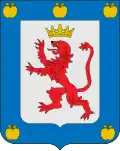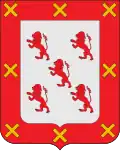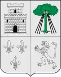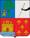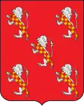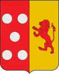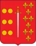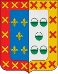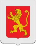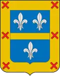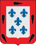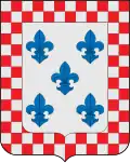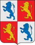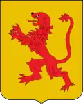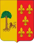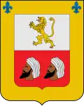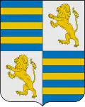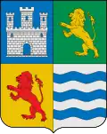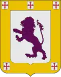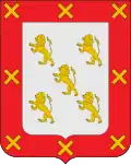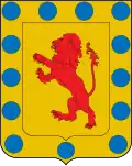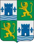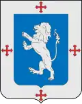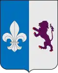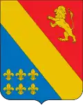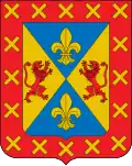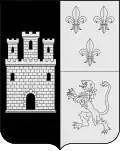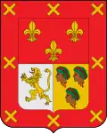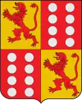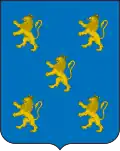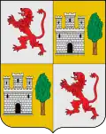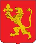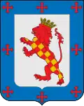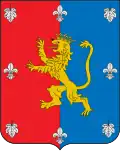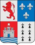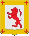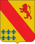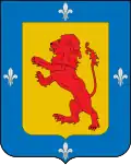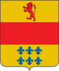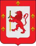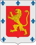 De oro, con una faja de gules; sobre la faja, un león de gules y bajo ella, seis lises de azur, dispuestas en dos fajas. |