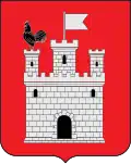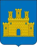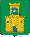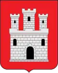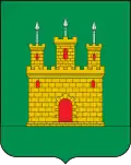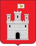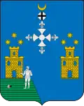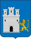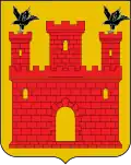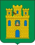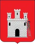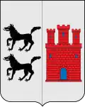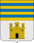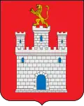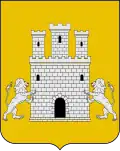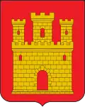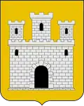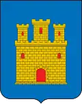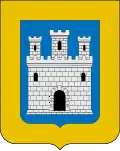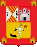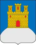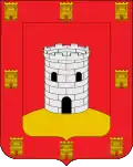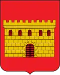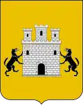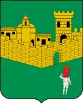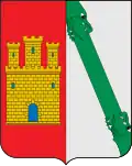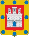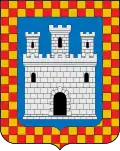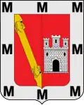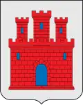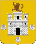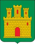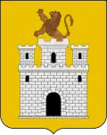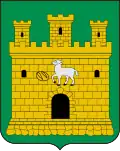 De gules con un castillo de oro en cuyo homenaje asoma un hombre armado, que sostiene en sus manos una banderola. Otro hombre armado, con lanza, en la puerta del castillo. De las almenas laterales de la torr, arrancan dos alas de oro, una a cada costado. [‘‘n’‘ 3] |