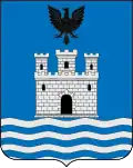 De azur con un castillo de plata sobre ondas de plata y azur, surmontado de un águila volante de sable. |