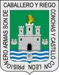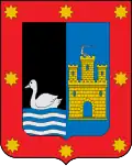 Escudo partido: 1º. De sable con un ánade de su color natural, sobre ondas de azur y plata. 2º. De azur con un castillo de oro de cuyo homenaje sale un brazo de plata, armado, que empuña una espada del mismo metal. Bordura general de gules, con ocho estrellas de oro. |