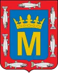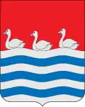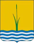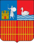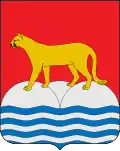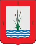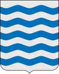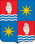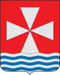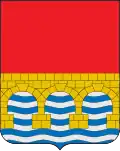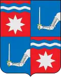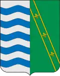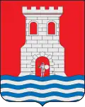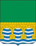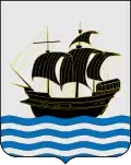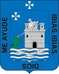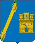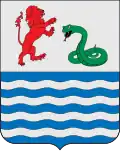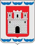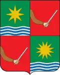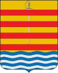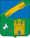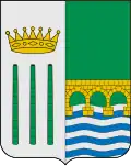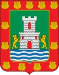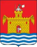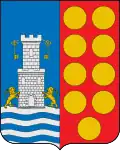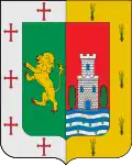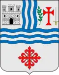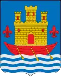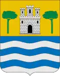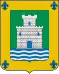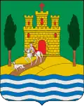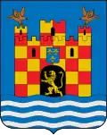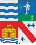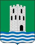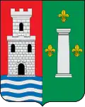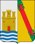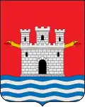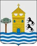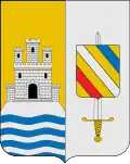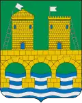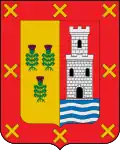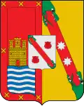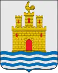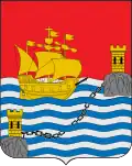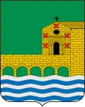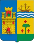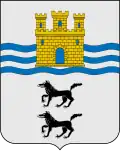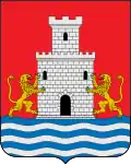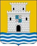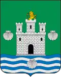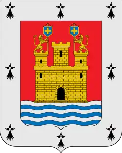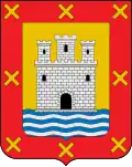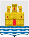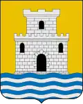 De gules con una torres de plata y dos leones rampantes a ella, uno a cada costado. Todo sobre ondas de azur y plata. [‘‘n’‘ 2] |
