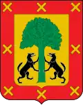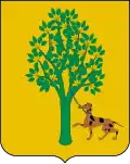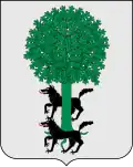 De plata con un árbol de sinople; y tres lobos de sable, andantes y atravesado a su tronco, dos delante y uno detrás. |