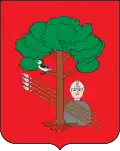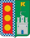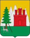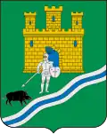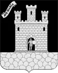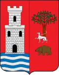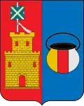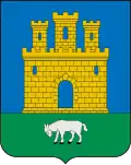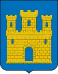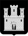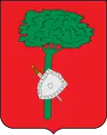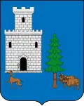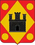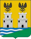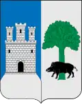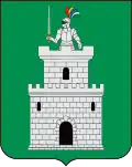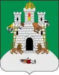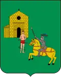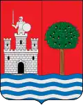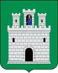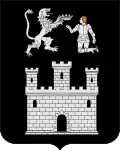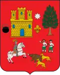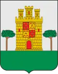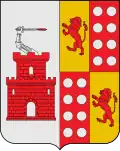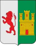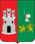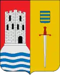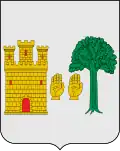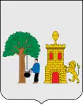 Escudo partido: 1º. De gules con un castillo de plata en cuyo homenaje hay un hombre armado, del mismo metal, que enarbola una espada en la mano diestra. 2º. De oro con un roble de sinople sobre ondas de azur y plata. |