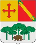 De oro con una banda de gules engolada en dragantes de sinople, acompañada en lo alto de una cruz floreteada, de gules; y en lo bajo, de un león rampante, de sable. |