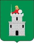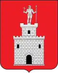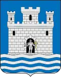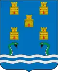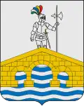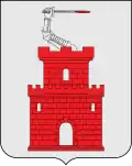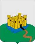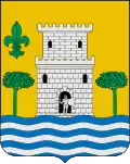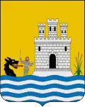 De sinople, con una torre de plata sobre ondas de azur y plata, a cuya puerta está un hombre armado, con una espada de plata guarnecida de oro y rodela de plata. |