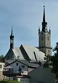 En 1522 fue incendiada y se reconstruyó en la segunda mitad del siglo XVI. Después de que la aguja se quemara en 1876, la actual torre neogótica se construyó con bloques de piedra en 1889 según proyecto de Friedrich von Schmidt. | |
