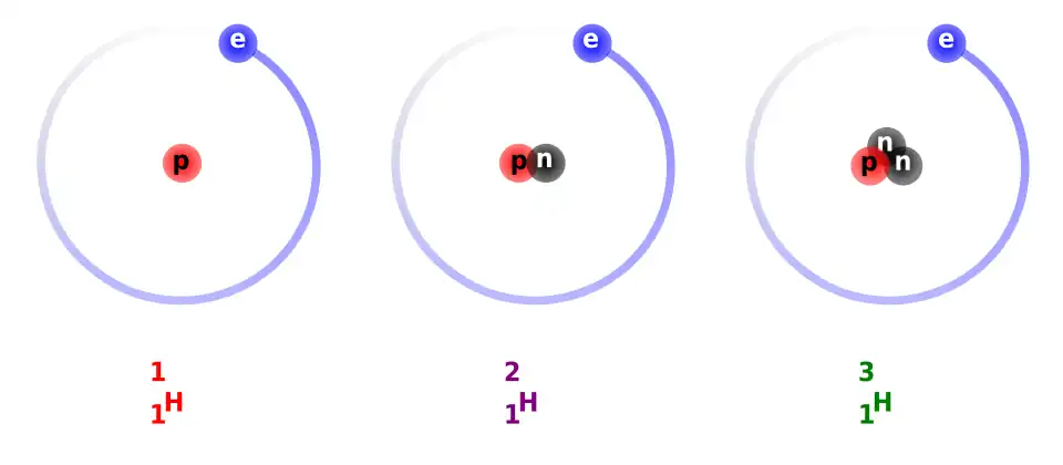 Esquema de los tres isótopos naturales del hidrógeno, de izquierda a derecha: protio, deuterio y tritio.