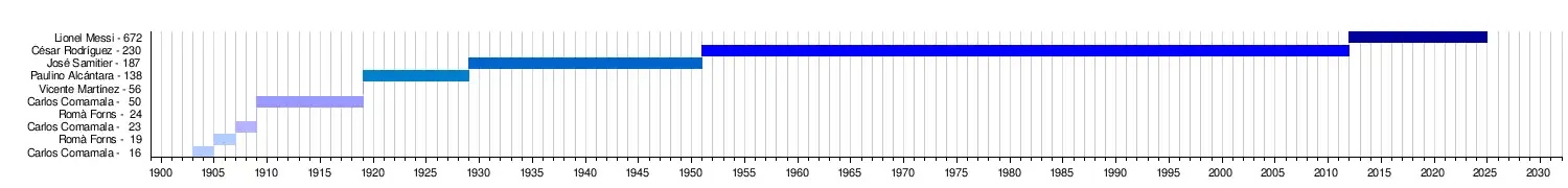 Entre los goleadores históricos, destaca Lionel Andrés Messi, como el máximo realizador en la historia del club con 672 goles en 778 partidos, siendo el primer jugador en la historia en tener el registro con más goles a nivel de clubes,[4][5] tras superar en la temporada 2013-14 a Telmo Zarra. Del mismo modo en la temporada 2011-12 superó el tope histórico de César Rodríguez, quien fuera el máximo goleador del club con 230 goles en 350 partidos, como mejor anotador español del club.[6][n 2] Destaca también José Samitier al ser el mayor realizador del club en la competición de Copa —bajo todas sus denominaciones históricas— con 64 tantos anotados en 75 partidos.