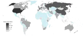 Oro para los países que consiguieron, al menos, una medalla de oro. Plata para los países que no consiguieron ninguna medalla de oro, pero sí, al menos, una medalla de plata. Bronce para los países que no consiguieron ninguna medalla de oro o plata, pero sí, al menos, una medalla de bronce. Azul para los países que no consiguieron ninguna medalla. Rojo para las entidades que no participaron.