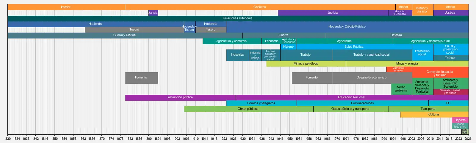Posteriormente se crearon otros ministerios del gabinete:[3] Ministerio de Justicia (1890), Ministerio de Obras Públicas (1905), Ministerio de Hacienda y del Tesoro (1905, se unifican en una sola entidad el Ministerio de Hacienda y el Ministerio del Tesoro), Ministerio de Agricultura (1913), Ministerio de Correos y Telégrafos (1923), Ministerio de Trabajo (1938), Ministerio de Minas y Petróleos (1940), Ministerio de Higiene (1946), Ministerio de Comercio Exterior (1991), Ministerio del Medio Ambiente (1993) y Ministerio de Cultura (1997).